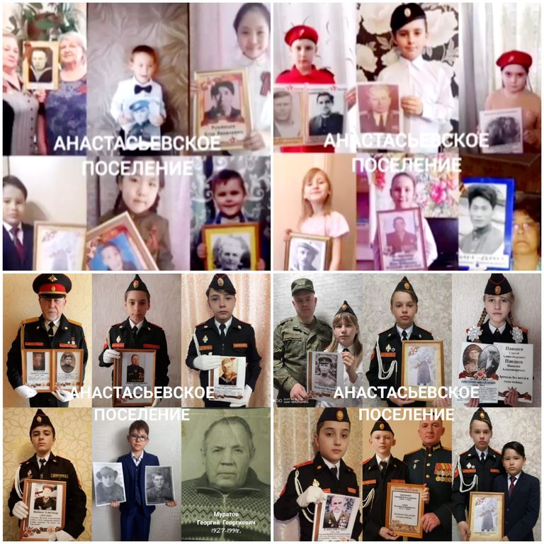 Акция «Бессмертный полк Анастасьевского сельского поселения» - прошла в социальных сетях 9 мая. В акции приняло участие 63 жителя поселения. Находясь в режиме самоизоляции в связи с коронавирусной инфекцией, мы объединились, чтобы почтить память своих героев, погибших в годы Великой Отечественной войны и ушедших из жизни уже в мирное время, и показать любовь и уважение к своей стране.