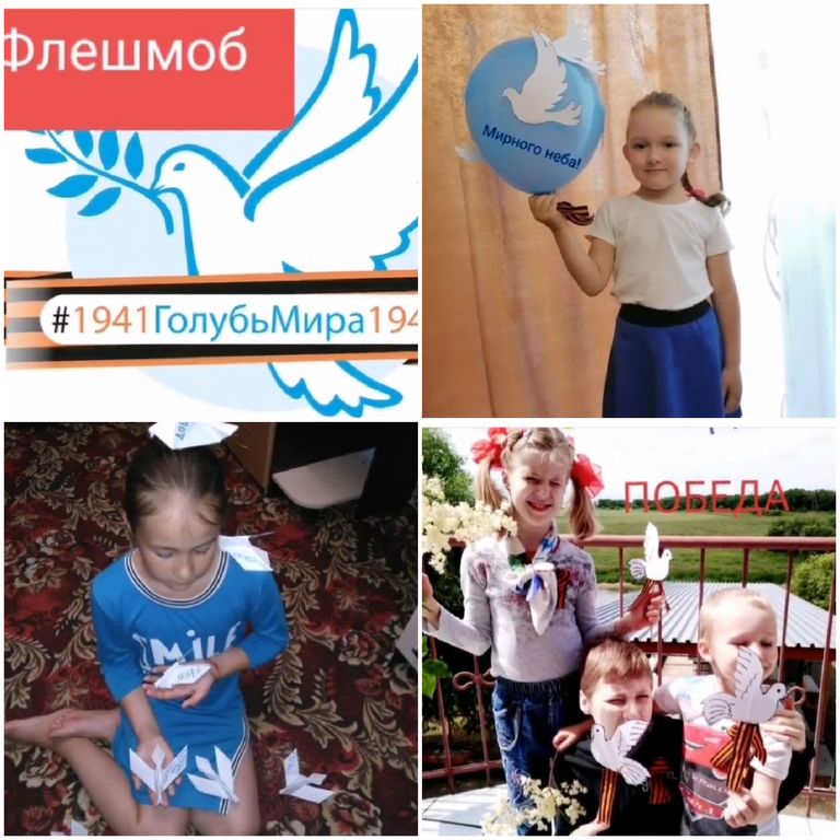 Флешмоб «Голубь мира». Белый голубь – самый узнаваемый символ мира. Ребята, участники флешмоба, сделали из бумаги фигурки голубя, картинки с его изображением, выражая тем самым свою благодарность ветеранам, важность мира для всей планеты.