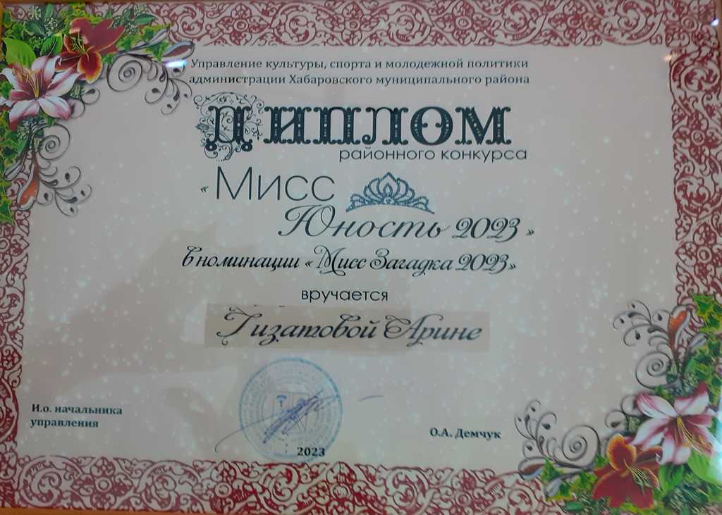 Наше Анастасьевское сельское поселение в конкурсе представляла Арина Гизатова – «МИСС ЗАГАДКА". Арина учиться на первом курсе Хабаровского техникума техносферной безопасности и промышленных технологий.