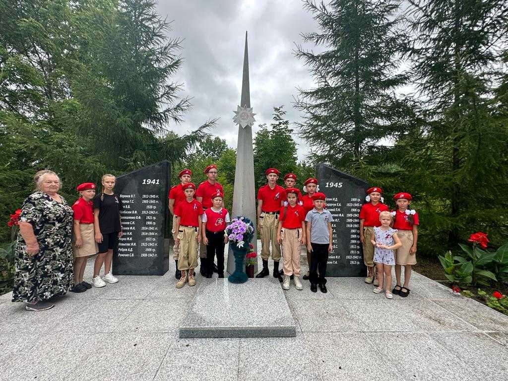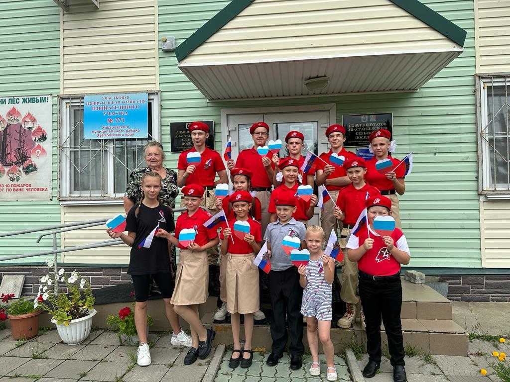 После праздничного мероприятия юнармейцы и их руководитель посетили обелиск погибшим в годы ВОВ жителям с. Анастасьевка, почтили их память минутой молчания и провели церемонию развёртывания государственного флага России.