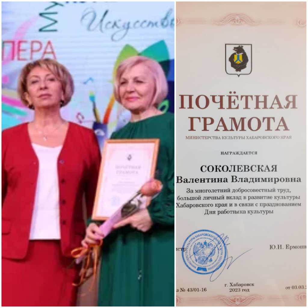 - Почётной грамотой Министерства культуры Хабаровского края - директор Соколевская Валентина Владимировна;