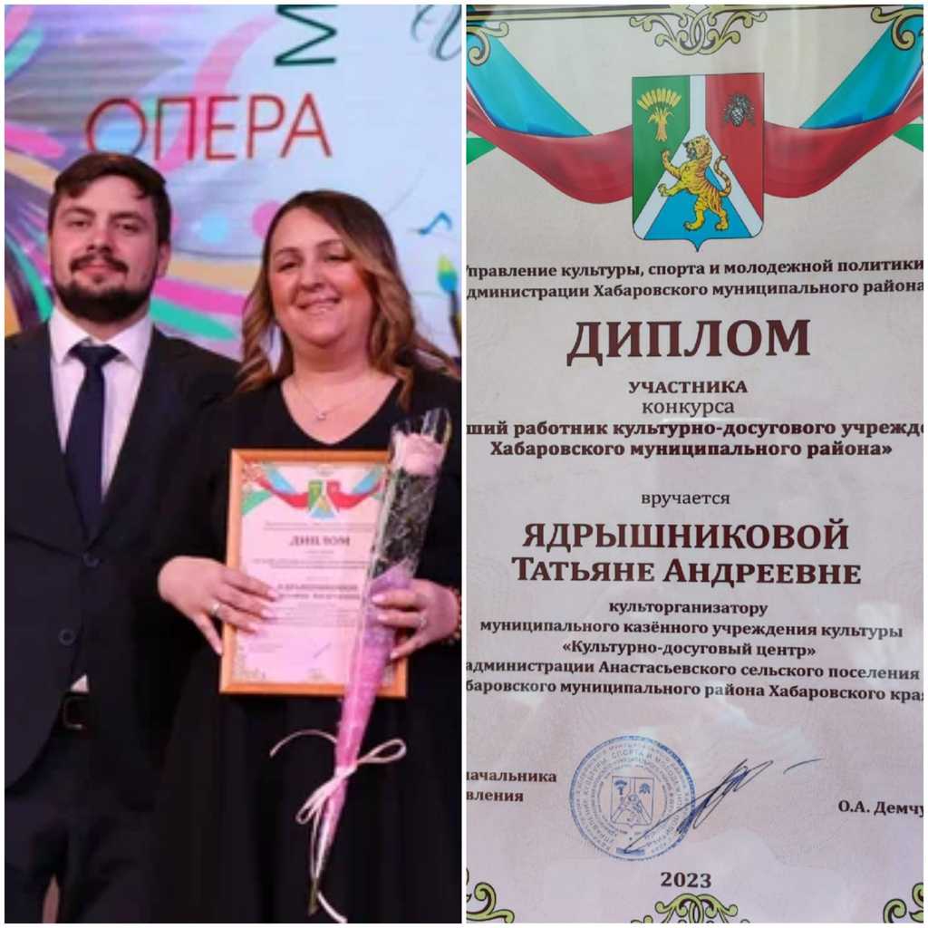 - Дипломом участника профессионального конкурса "Лучший работник культурно- досугового учреждения Хабаровского муниципального района" - культорганизатор Ядрышникова Татьяна Андреевна.